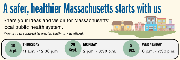 The Department of Public Health invites you to join them at upcoming public hearings on SAPHE 2.0, a new law that elevates our ability to provide equitable public health protections and build a stronger, more resilient state. DPH invites anyone with an interest in local public health to share your vision for Massachusetts’ local