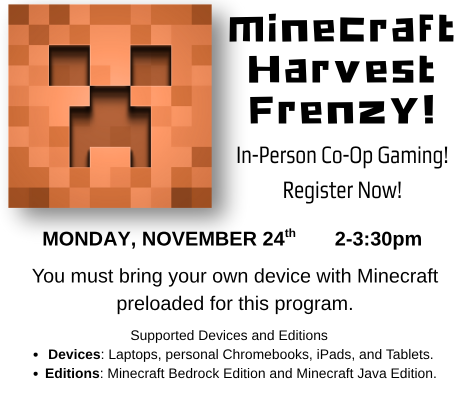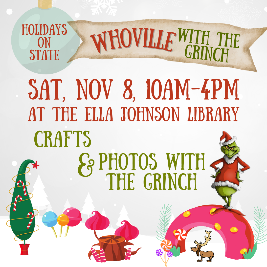 Stop by the Library this Saturday during Holidays on Stateto meet the Grinch! Mr. Grinch will be available for a photo op 10am-12pm and 1pm-4pm. We will have a crafts and games available as well. Grinch BINGO will run from 12 noon-1pm.