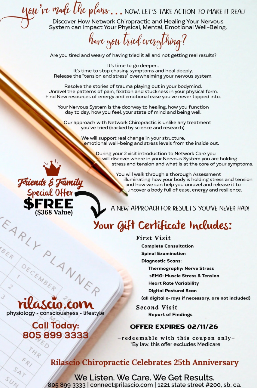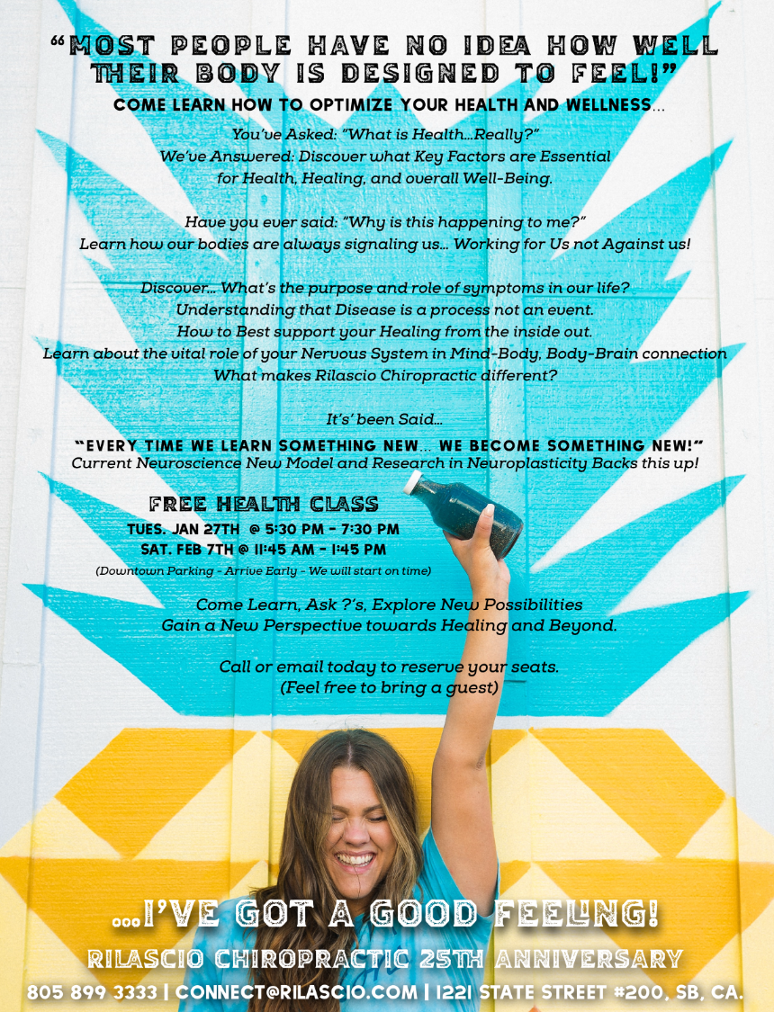 Join a FREE ongoing Health & Wellness Series at Rilascio Chiropractic! Discover what's essential for health, healing, and well-being. Learn about the vital role of the nervous system and how to support healing from the inside out. Get to the root of symptoms and become something new! Ask questions, explore possibilities, and gain new perspectives on healing and beyond! The next class is Tuesday, February 7th, at 11:45 AM. Call now to reserve your spot: 805-899-3333. Space is limited—bring a friend!