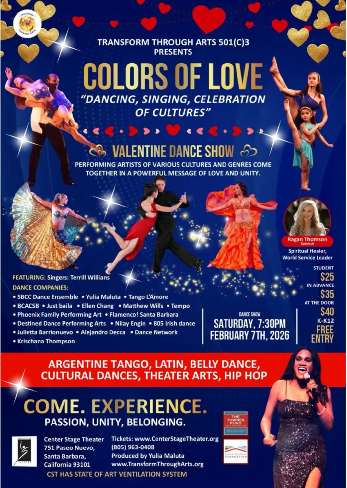 Enjoy the 12th Annual Colors of Love Multicultural Dance Show, a multicultural dance performance open to audiences of all generations. The program features professional dancers and live musicians presenting a variety of styles, including Argentine Tango, Samba, Belly Dance, Latin, Flamenco, and other cultural dances. Experience the power of artists coming together in unity through dance and live music in a welcoming environment where everyone belongs.