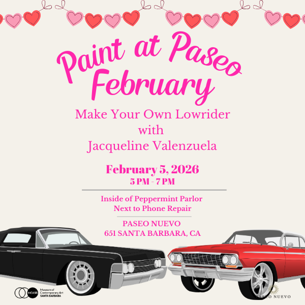 Join the Museum of Contemporary Art Santa Barbara for a "Make Your Own Lowrider" workshop with interdisciplinary artist Jaqueline Valenzuela, whose practice reflects the deep roots she's planted in the lowrider community by bridging the gap between fine art and this underrepresented culture. This workshop is free for all ages. RSVP encouraged.