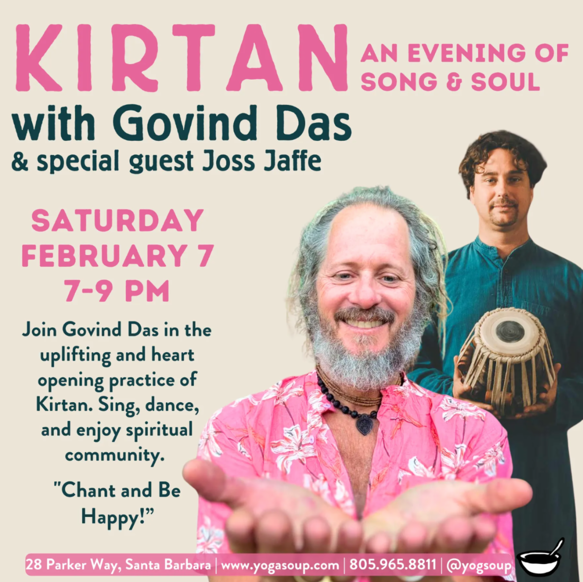 Join Govind Das in the uplifting and heart-opening practice of Kirtan. Kirtan is an ancient bhakti yoga practice using mantra and music as an expression of devotion and prayer. The literal translation of "kirtan" is "to praise." Kirtan is described as a "jewel of a spiritual practice" because of its joyful, open-hearted, meditative, and communal feeling.