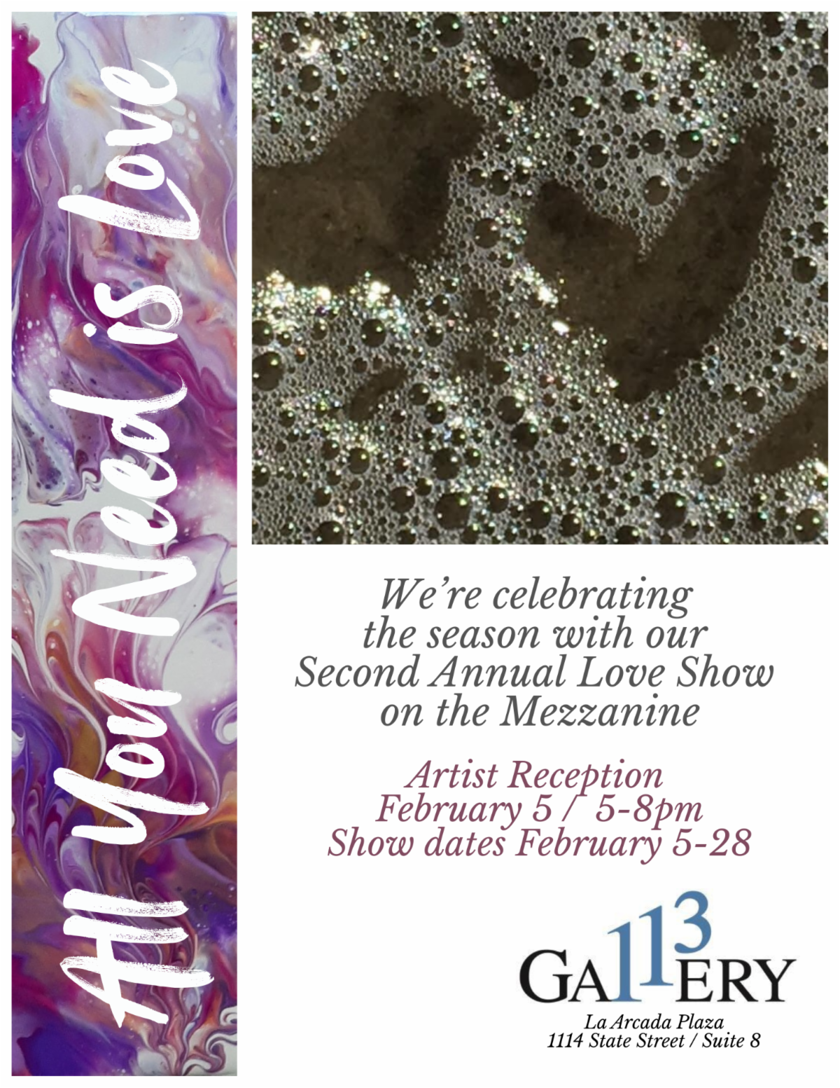 Gallery 113 is proud to announce their 2nd annual Valentine's Day show! During February, and in addition to their regular exhibit, they will be celebrating Valentine's Day with a special show on the mezzanine level of the gallery. Go see the fabulous 'love' art created by talented artists from the Santa Barbara Art Association. The show opens February 5th. The artist reception takes place February 5th, from 5:00 to 8:00 PM. Grab some beautiful artwork for your sweetie. The show will run through February 28th.