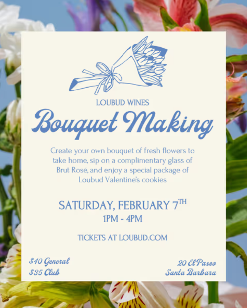 Join Loubud Wines for a lovely afternoon of Bouquet Making on February 7th, from 1:00 to 4:00 PM. Create your own fresh flower bouquet to take home while sipping on a complimentary glass of Brut Rosé and enjoying a special package of Loubud Valentine's cookies. Enjoy a delightful afternoon of bubbles, fresh flowers, and delicious sugar cookies made by the talented Elise Greganti of The Witchy Baker!