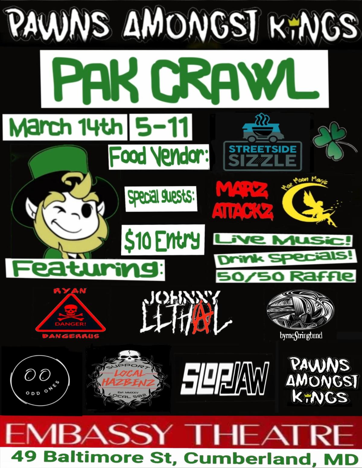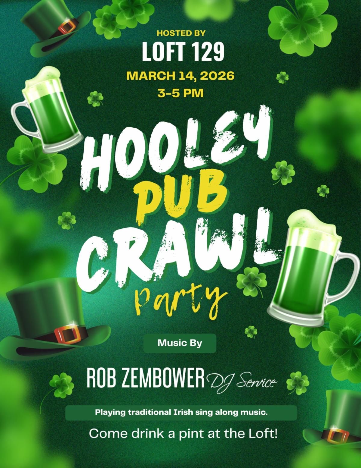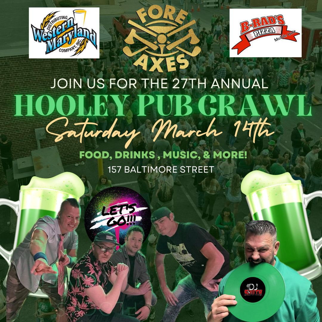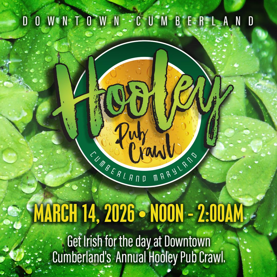 | | Hooley Pub Crawl Saturday, March 14 • 10 am – 2 am Get Irish for the day at Downtown Cumberland’s 27th Hooley Pub Crawl featuring music, sing-a-longs, and other popular entertainers from the tri-state area. A full slate of entertainers will perform throughout the day at Downtown Cumberland and South Cumberland locations. There will be plenty of libations and music, so put on your green and head to Downtown Cumberland. Visit https://cumberlandalive.com/hooley-pub-crawl/ or https://www.facebook.com/events/1362898691828188 | | |