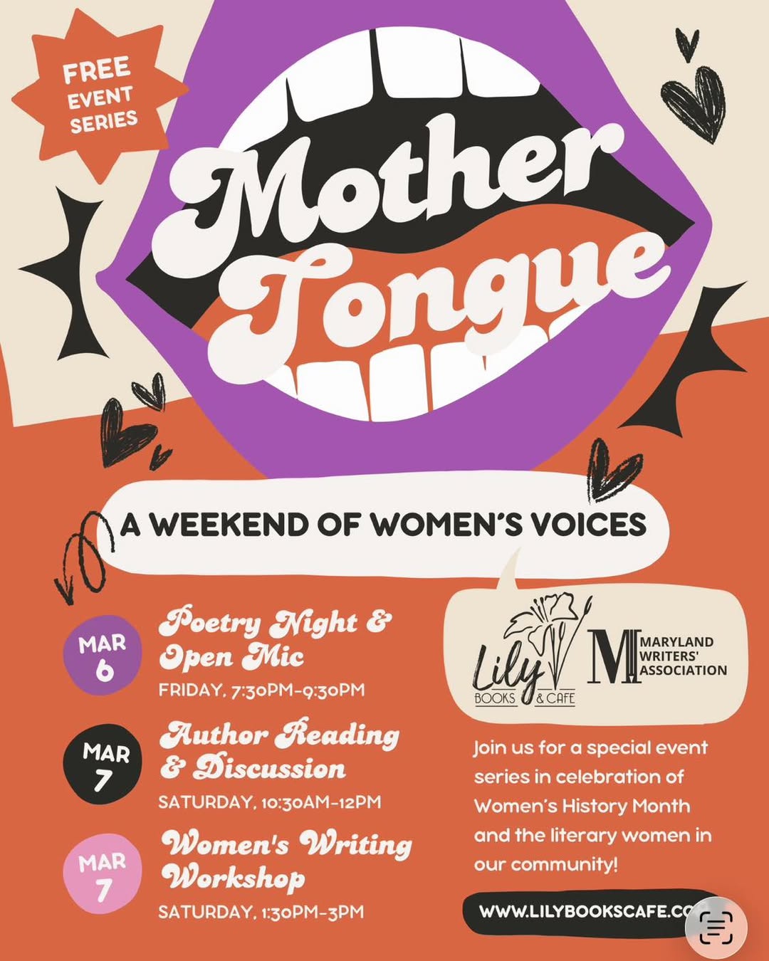 Big News! Put on your calendar! Mother Tongue: a Weekend of Women’s Voices brings together outstanding women poets, writers, authors, and readers from our community for a weekend of literary enjoyment and appreciation. As we kick off Women's History Month this March, Lily Books & Cafe and the Cumberland Chapter of the Maryland Writers' Association are partnering to offer an exciting program of lit-focused events highlighting and celebrating women’s voices. Featured events include a women's poetry reading and open mic night at Loft 129, followed by a panel of local author readings and discussion, a luncheon and book signings, and ending the day with a hands-on writing workshop, all at Lily Books & Cafe. Mother Tongue is free to attend and open to all genders. We hope you will join us in celebration, community, and creativity.