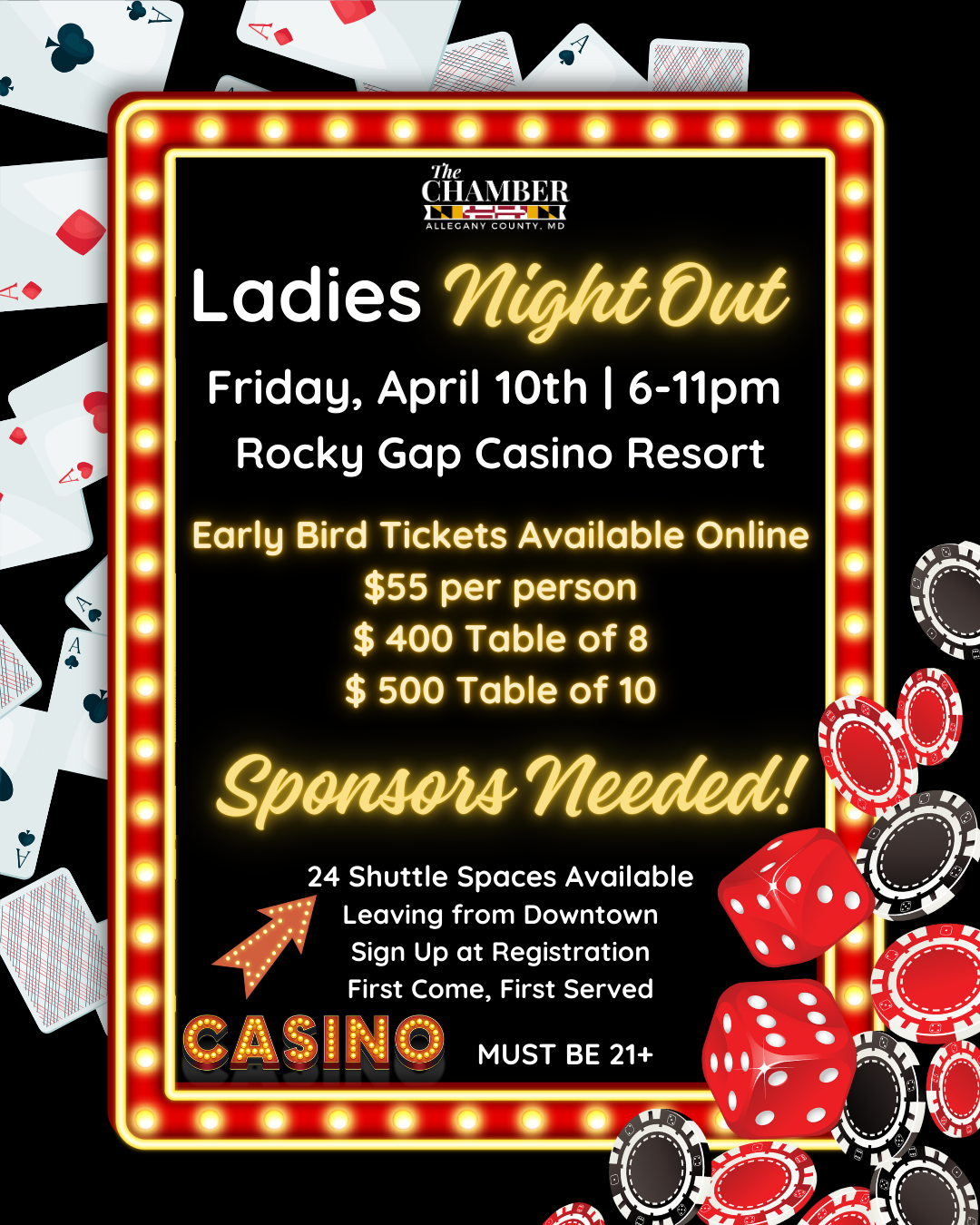 April 10, 6 – 11 pm. Join us for an unforgettable evening at the Allegany County Chamber of Commerce’s annual Ladies Night Out! This event is all about fun, food, drinks, and great company, so grab your friends and get ready to have a blast.