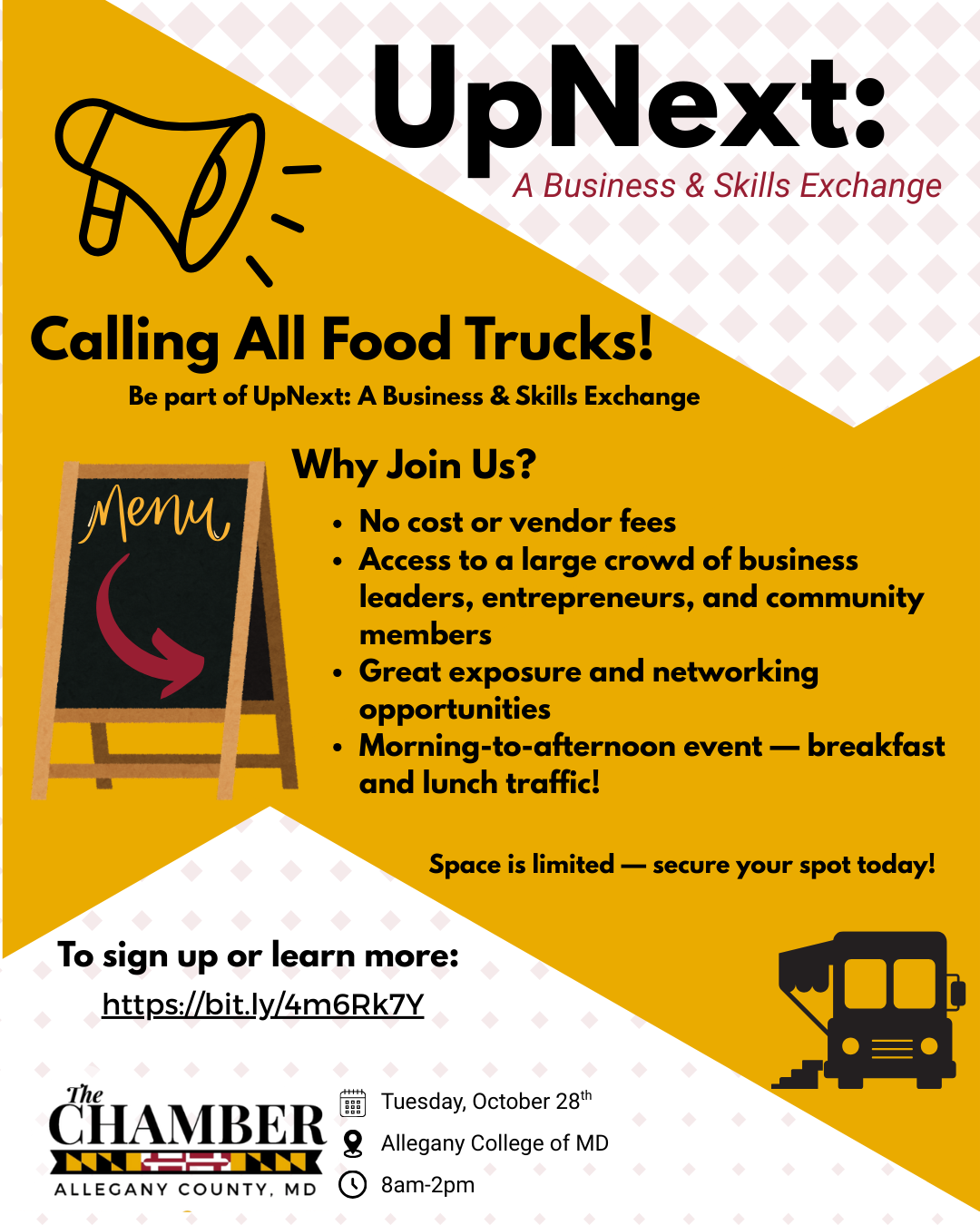 We are pleased to present UpNext: A Business & Skills Exchange hosted at Allegany College of Maryland in the Student Center on Tuesday, October 28th from 8am - 2pm.