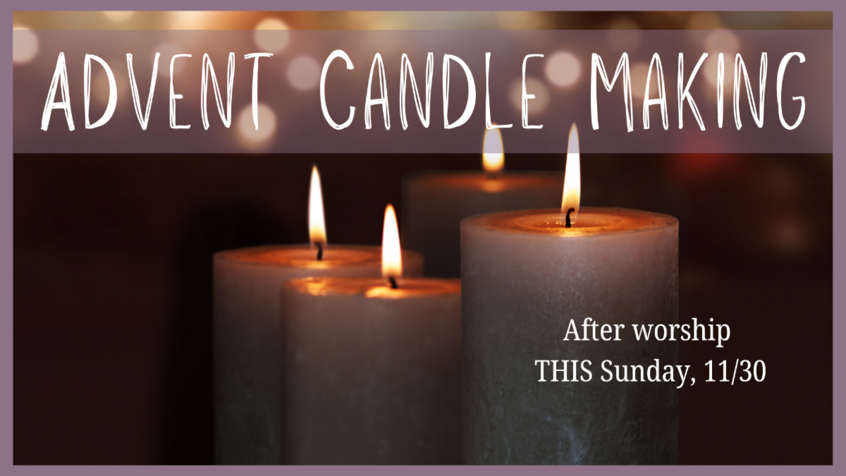 Immediately following worship on Sunday, we’re kicking off the Advent season by making Advent candles together! You’ll get to take home your hand-rolled candles and a short liturgy, and each Sunday celebrate the coming of Jesus by lighting your candles and engaging faith at home.
