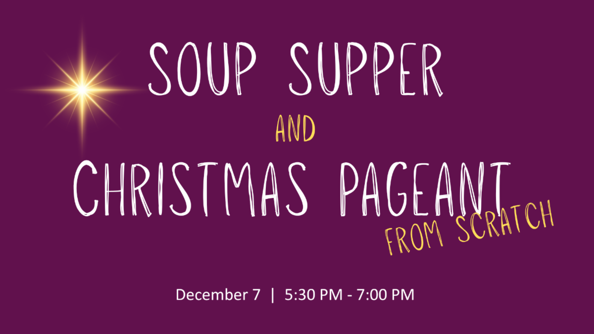 On Sunday, December 7th from 5:30-7:00 PM we will have our annual Soup Supper and Christmas Pageant from Scratch! This is one of our best events of the year, with great fellowship over a meal, vaguely controlled chaos, and the most fun way to celebrate the Christmas story! No rehearsal needed, just bring a soup or dessert if you can and get ready for some fun!