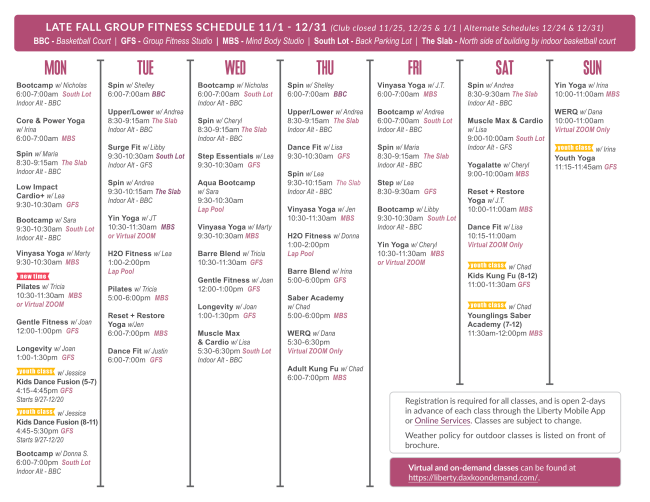 Registration is required for all classes, and is open 2-days in advance of each class through the Liberty Mobile App or Online Services. Classes are subject to change.