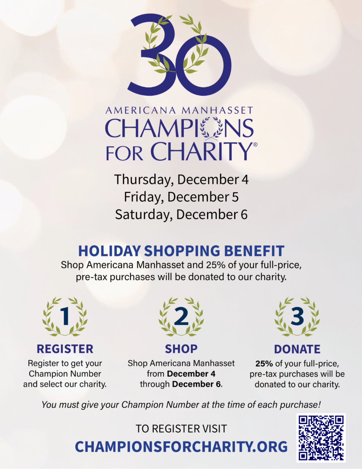 From December 4–7, shop at ANY participating store at Americana Manhasset, present your CHAMPION NUMBER at checkout, and 25% of your full-price, pre-tax purchases will be donated to the Michael Magro Foundation. Check out the flyer below!