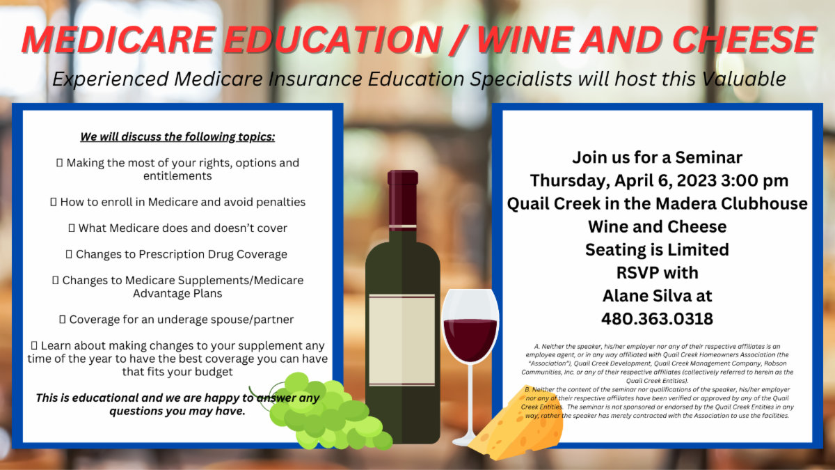 The programs, speakers, views, and opinions expressed in What's Happening announcements submitted by individuals, clubs, or organizations do not necessarily reflect the views of the Quail Creek Property Owners Assn., or its managers, officers, employees, agents, or representatives. | |