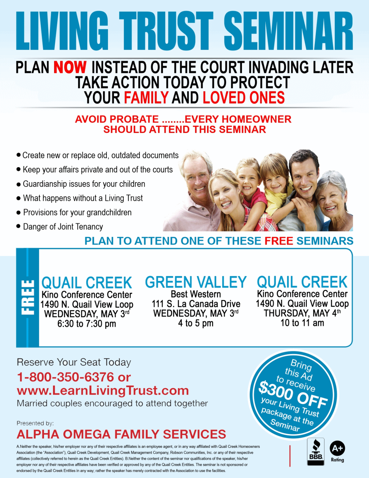 Alpha Omega Family Services has been helping families for two decades with educational seminars that explain the importance of a living trust. We help people understand why they should create an estate plan, effectively communicating information in a clear and precise way. RSVP today at 1-800-350-6376 or LearnLivingTrust.com.