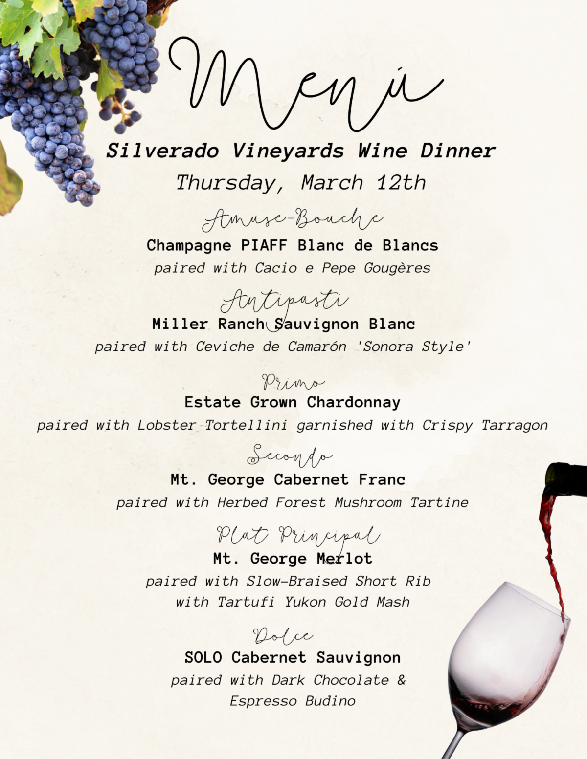 On March 12th, we invite you to join us for what will undoubtedly be one of the most anticipated wine evenings of the season—an intimate dinner featuring the wines of Silverado Vineyards.