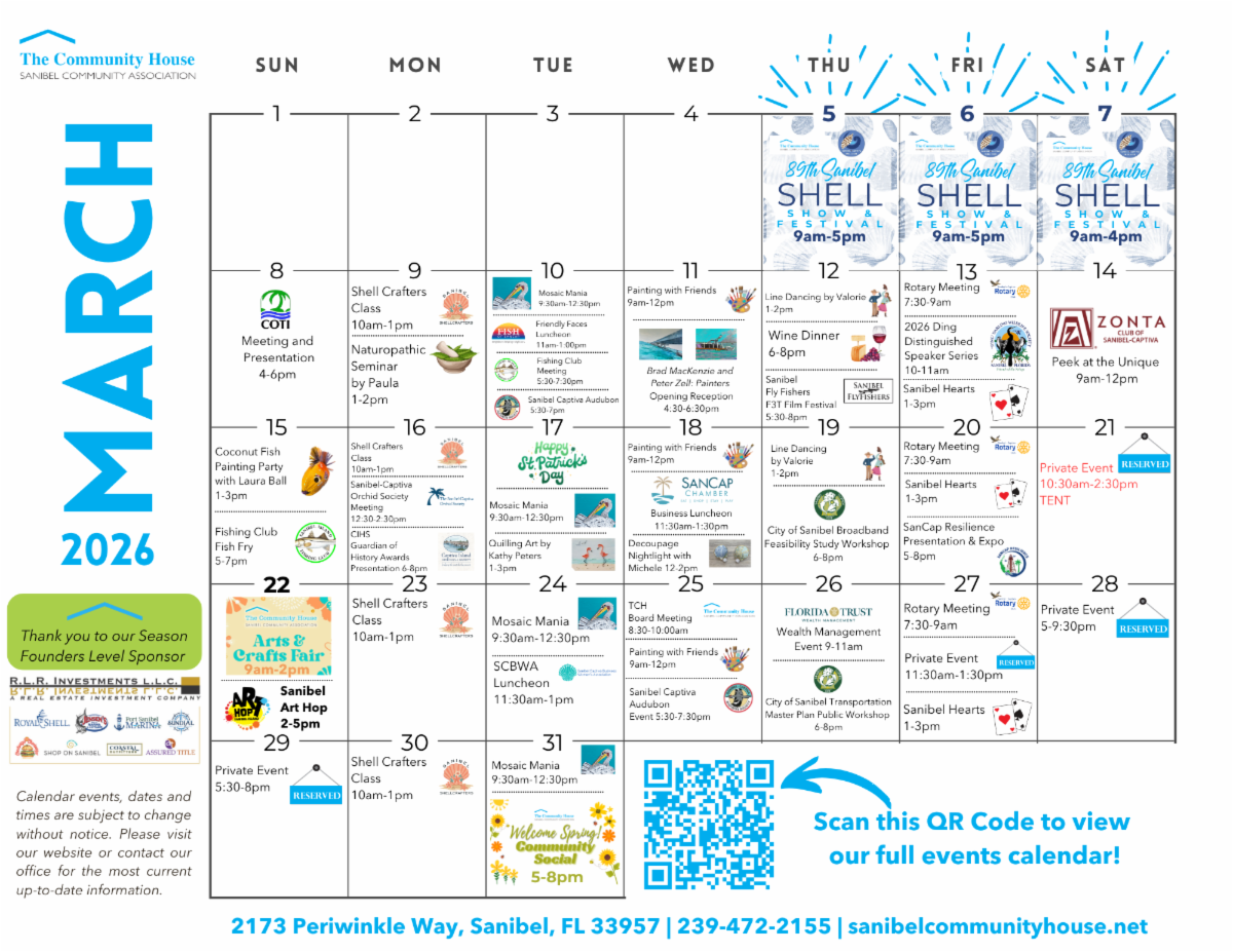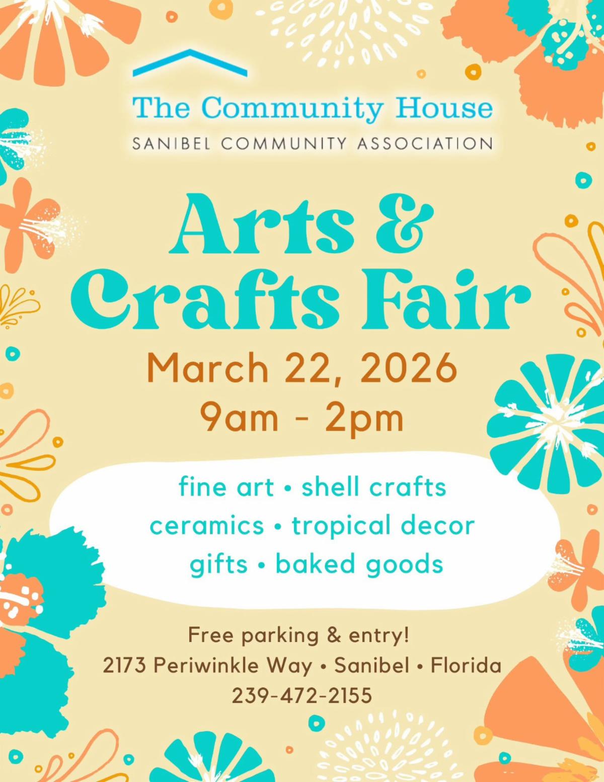 Come join us at the March Arts & Crafts Fair, indoors at the Community House! Show your support for local artists and discover a wide variety of uniquely Sanibel items at this event.