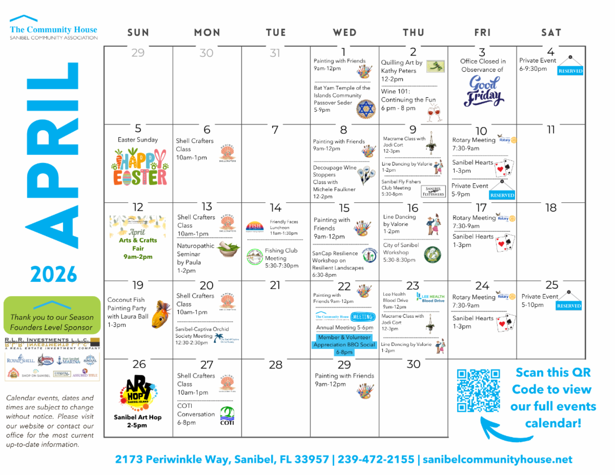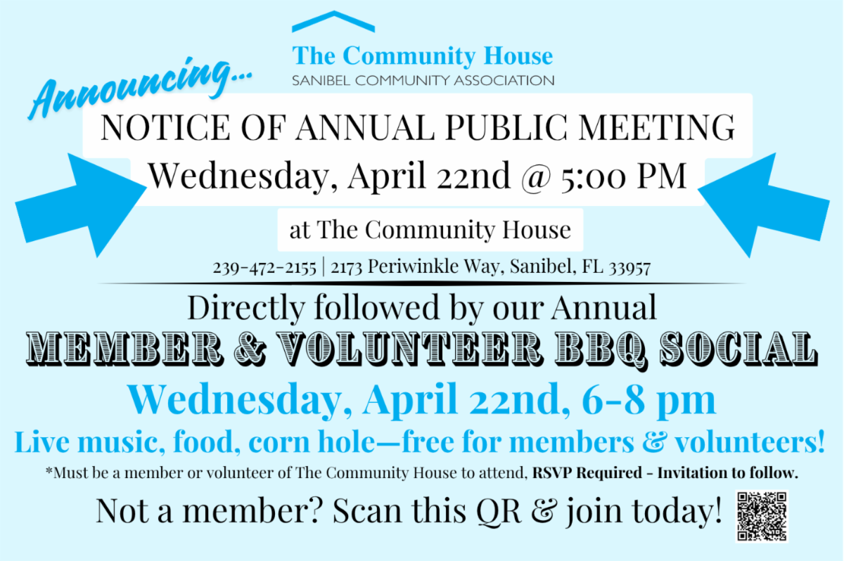 In observance of Good Friday, the Sanibel Community House will be closed on Friday, April 3rd. Regular office hours (Monday to Friday, 9am–3pm) will resume on Monday, April 6th.