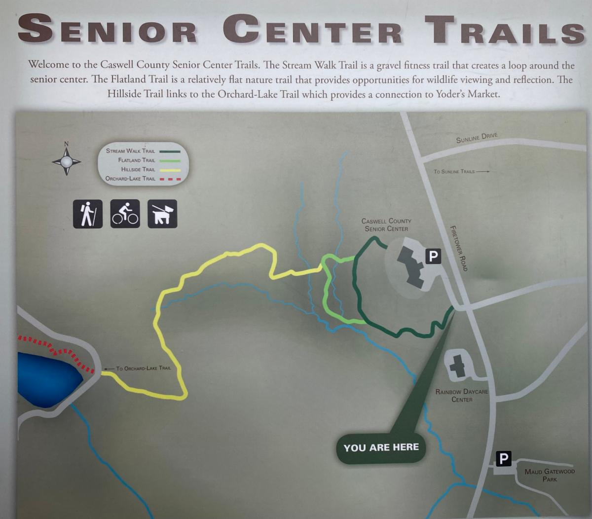 In Caswell if you haven’t seen some of our trails, now is a wonderful time to get acquainted with them. The Senior Center Tails system includes several footpaths in Yanceyville. The Stream Walk is a gravel fitness trail that creates a loop around the senior center. The Flatland Trail is relatively flat in nature trail that provides opportunities for wildlife viewing and reflection. The Hillside Trail links to the Orchard-Lake Trail which provides a connection to Yoder’s Market.