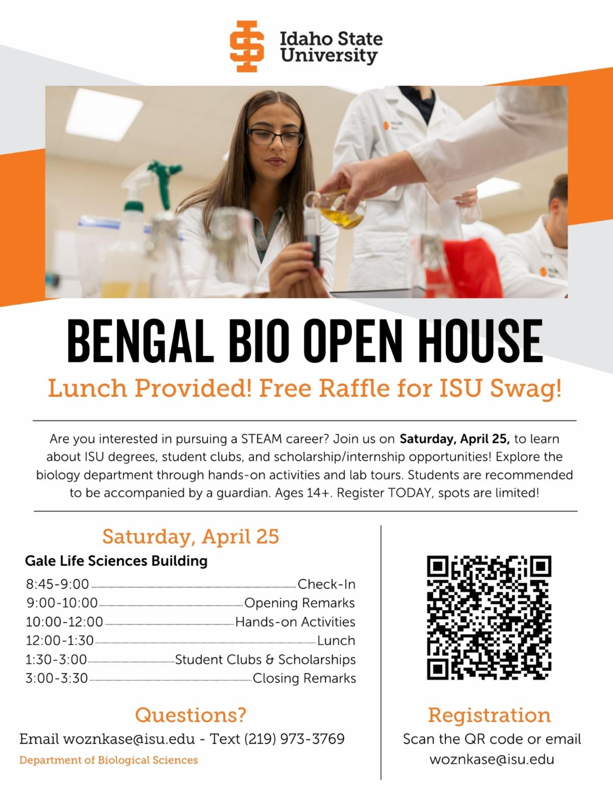 The Department of Biological Sciences will host the Bengal Bio Open House on Saturday, April 25, from 8:45 a.m. to 3:30 p.m. at the Gale Life Sciences Building. At the event, students ages 14+ can learn more about ISU degrees, student clubs, scholarship and internship opportunities, and more. Lunch will be provided.
