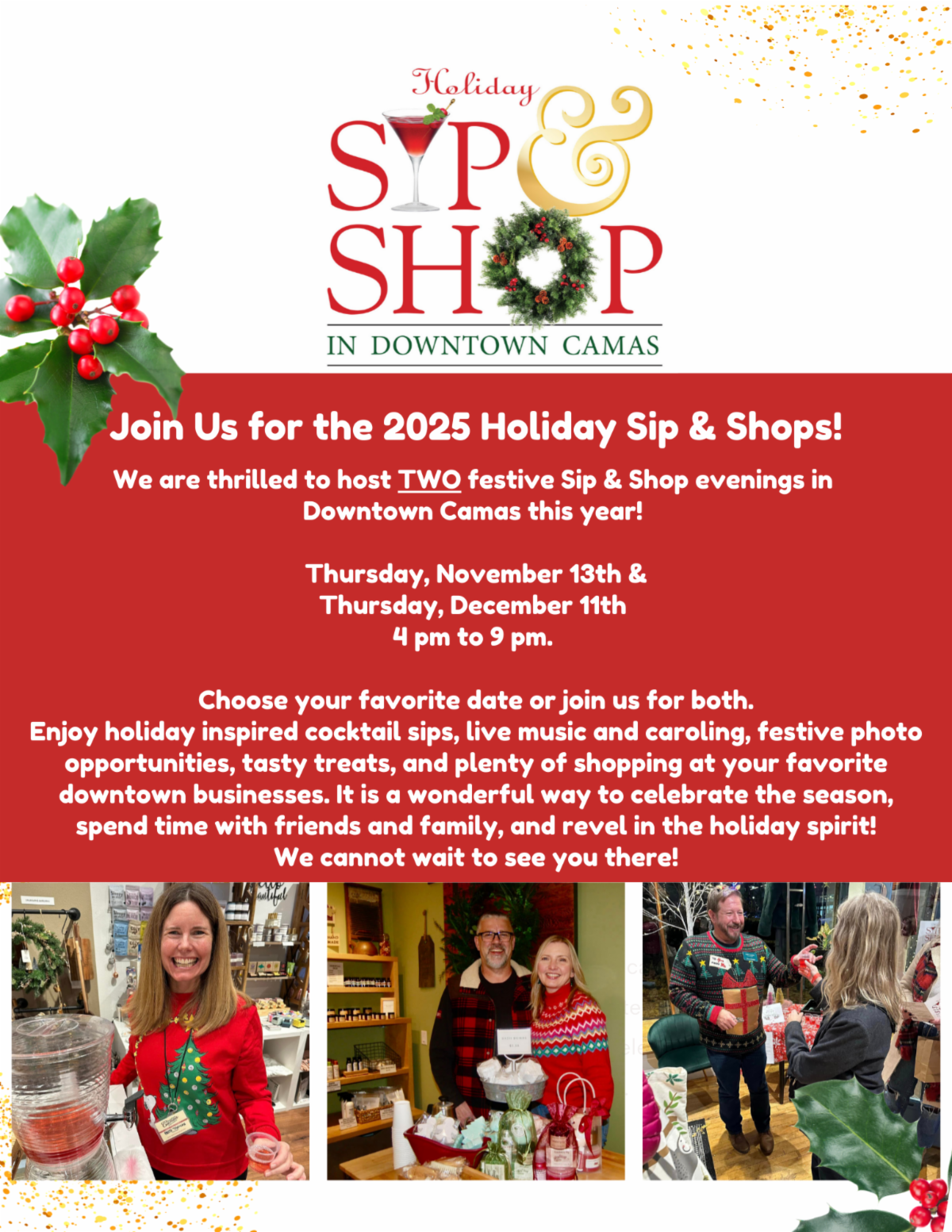 Festive holiday shopping, good friends, cocktail tastings, and holiday music – so much fun during the Holiday Sip & Shop in Downtown Camas! Such a fun tradition! On Thursday, November 13th and again on Thursday, December 11th, both from 4-9pm!