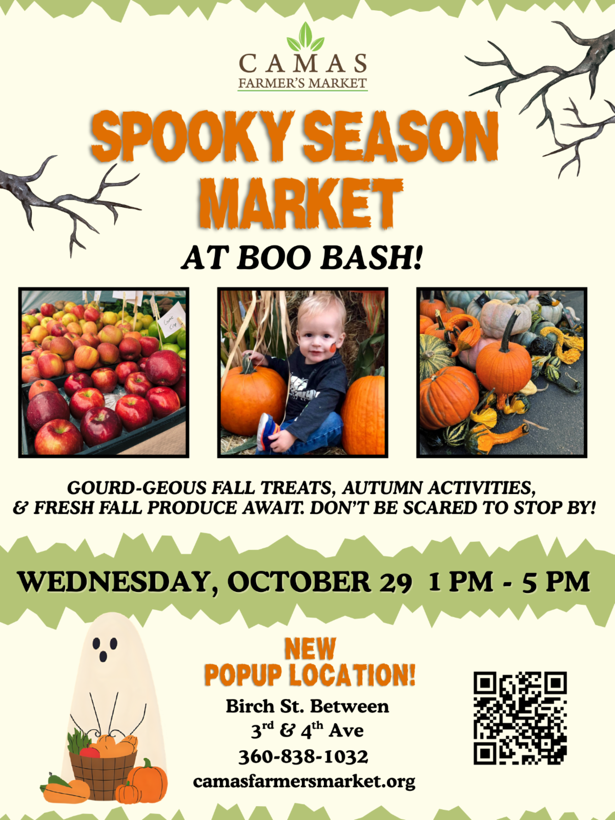 | Boo Bash Spooky Season Market is New This Year! | Spooky Season Market pops up at Boo Bash! Stop by Wednesday, October 29th from 1pm-5pm and enjoy shopping for fall produce and seasonal treats! It will be a Camas Farmer's Market special pop-up in a new location on Birch St between 3rd & 4th Ave. Another fun thing to do on Boo Bash day! | Free Community Dance Party with Dance 5.0! | |