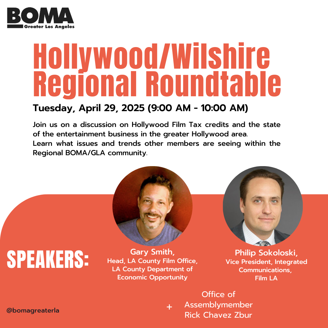 As we head into the thick of California’s legislative cycle our team has been actively engaged with our state partner BOMA/CAL on key legislation: opposing Vacancy taxes like SB 789 (Sen. Menjivar), Commercial real estate rent control AB 380 (Asm. Gonzalez) and supporting legislation like the Hollywood Film Tax Credit Bills (SB 630 and AB 1138 from Sen. Ben Allen and Asm. Zbur and Bryan) and AB 698 (Asm. Wicks) which would require a city to develop and post an analysis that examines the effect of a proposed property transfer tax before placing such an initiative on the ballot (what Measure ULA did not do).