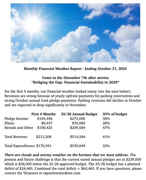 The finance team, church council, and the Peace Village Housing Management Committee invite you to an important presentation after worship on Sunday, December 7. The topic will be the current status of our finances and the outlook for the next 4 years.