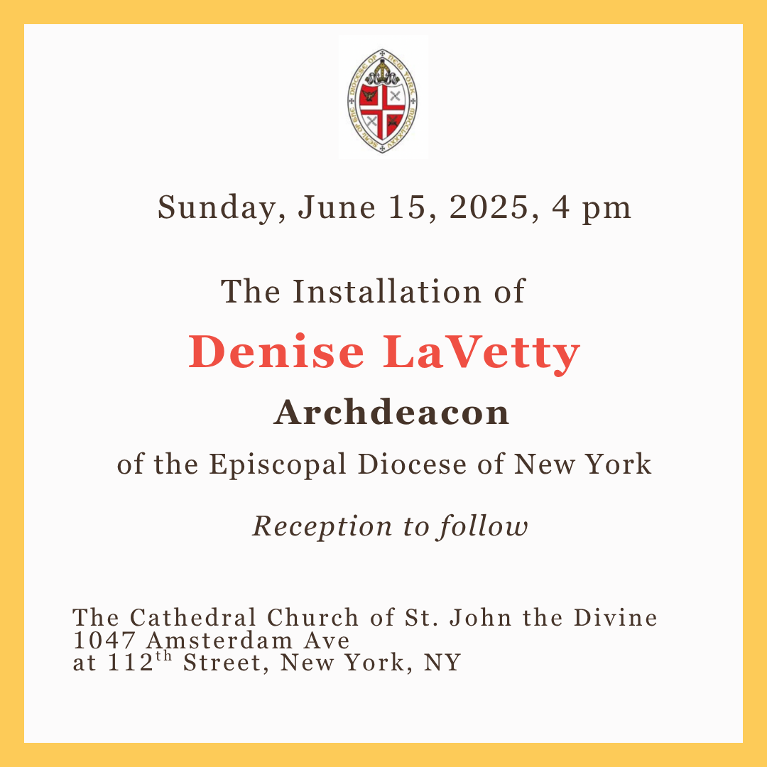 We joyfully invite you to attend the Installation of Denise LaVetty as Archdeacon for the Episcopal Diocese of New York, during Choral Evensong at the Cathedral Church of Saint John the Divine.