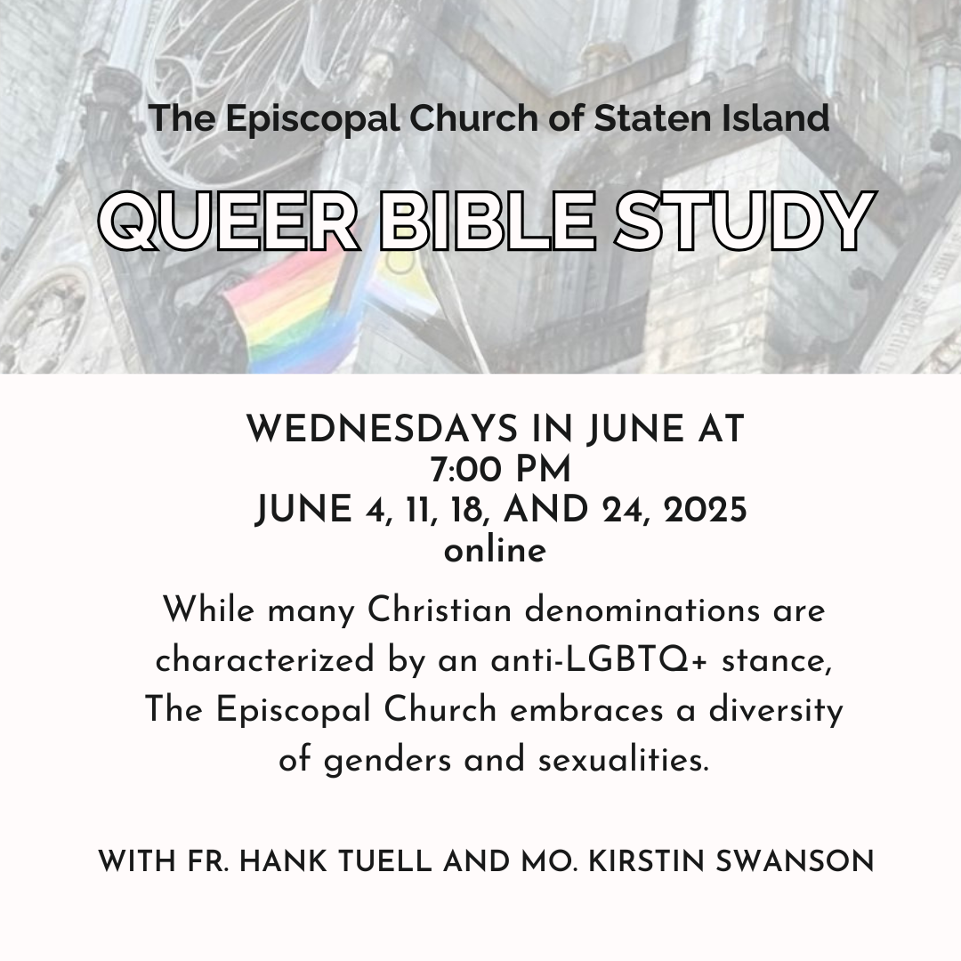 Join us for an enlightening Queer Bible Study with the Episcopal Church on Staten Island! Dive into inclusive interpretations of the Bible that celebrate diversity and love, with Fr. Hank Tuell and Mo. Kirstin Swanson.
