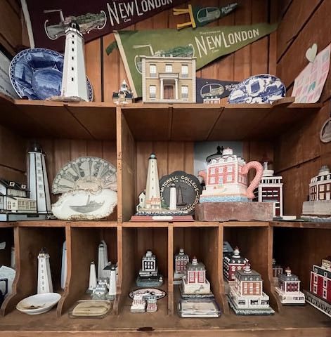 We're using this disruption to reorganize. In addition to installing three new exhibitions, our New London lighthouses & landmarks' souvenir collection has moved into the Kid's Ahoy gallery. Local lighthouses have long been beloved souvenir subjects, and we have a slew of examples.