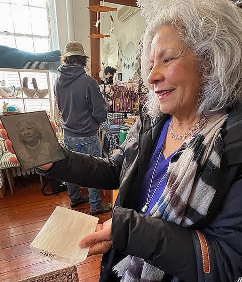 Subjects from Greg Shea's Valentines' Day tintype portraits continue to come back to pick up the finished photographs. Nearly everyone wants another portrait done, so we will be scheduling an additional day of portrait sessions in mid-April. When Karen Navarre, right, picked up hers and took a look, she remarked she could see her ancestors in her face--a reminder of the quiet power these images can hold.