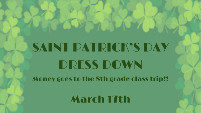 Get ready to don your finest green garb as we celebrate Saint Patrick Dress Down Day! It's time to let your inner leprechaun shine and support our Eighth graders as their final class trip approaches.