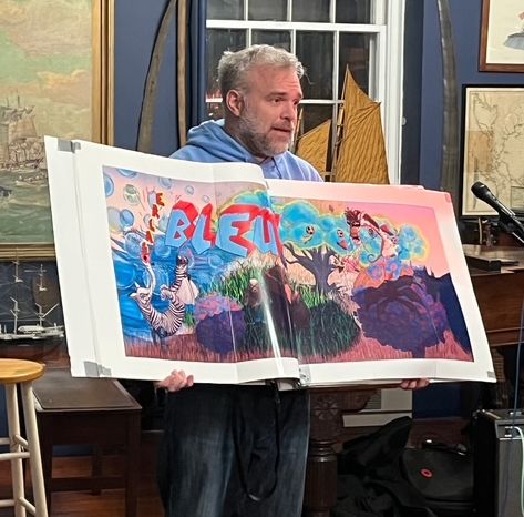 Last Tuesday was double-booked: third-graders and Jibboom both at the same time! But that meant students from Nathan Hale -- NL's arts magnet school -- got to meet artist Jon Buller, who was the Jibboom speaker. While students liked learning from Jody Barthel about historic landmarks, lighthouse lenses and the Amistad story, they really loved Jon's cartoon exhibition.