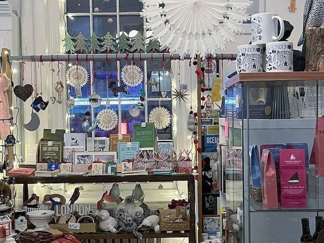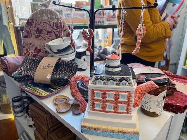 Photos, below, clockwise from top: Ornaments, holiday cards, chocolate lobsters, and fuzzy stuffed birds; batik napkins, black fig jam, a vintage Ledge Light teapot; two large Soderberg prints.