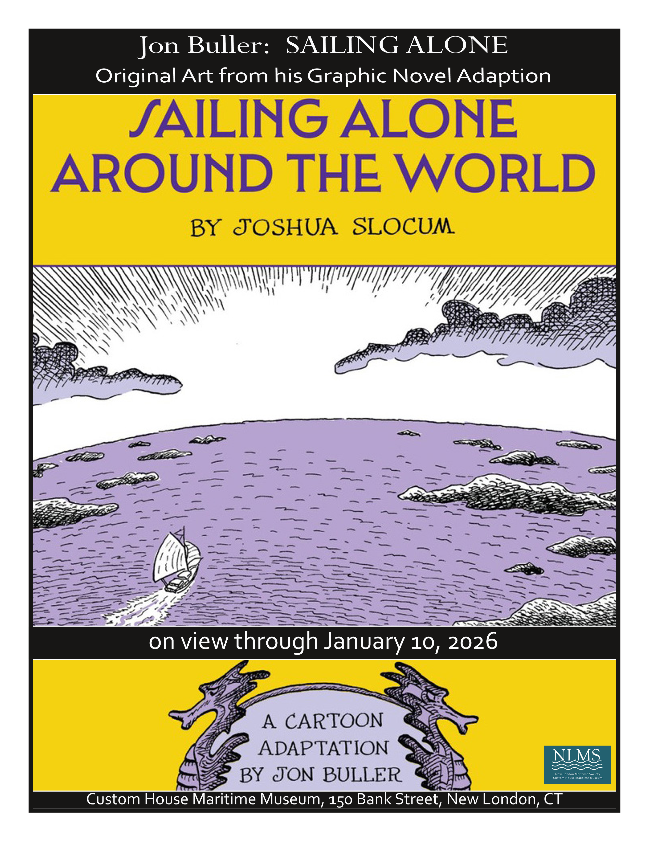 And speaking of Joshua Slocum -- whose circumnavigation is the basis of Mr. Buller's artworks -- we received an article from William 'Sandy' Welte in Camden, Maine. Mr. Welte researched the week in 1882 when Capt. Joshua Slocum passed through New London. Entitled 'MUTINY IN THE HARBOR: Joshua Slocum’s Lost Week in New London', Mr Welte suggests that Slocum's difficult experience in New London may have prompted his subsequent decision to henceforth sail alone.