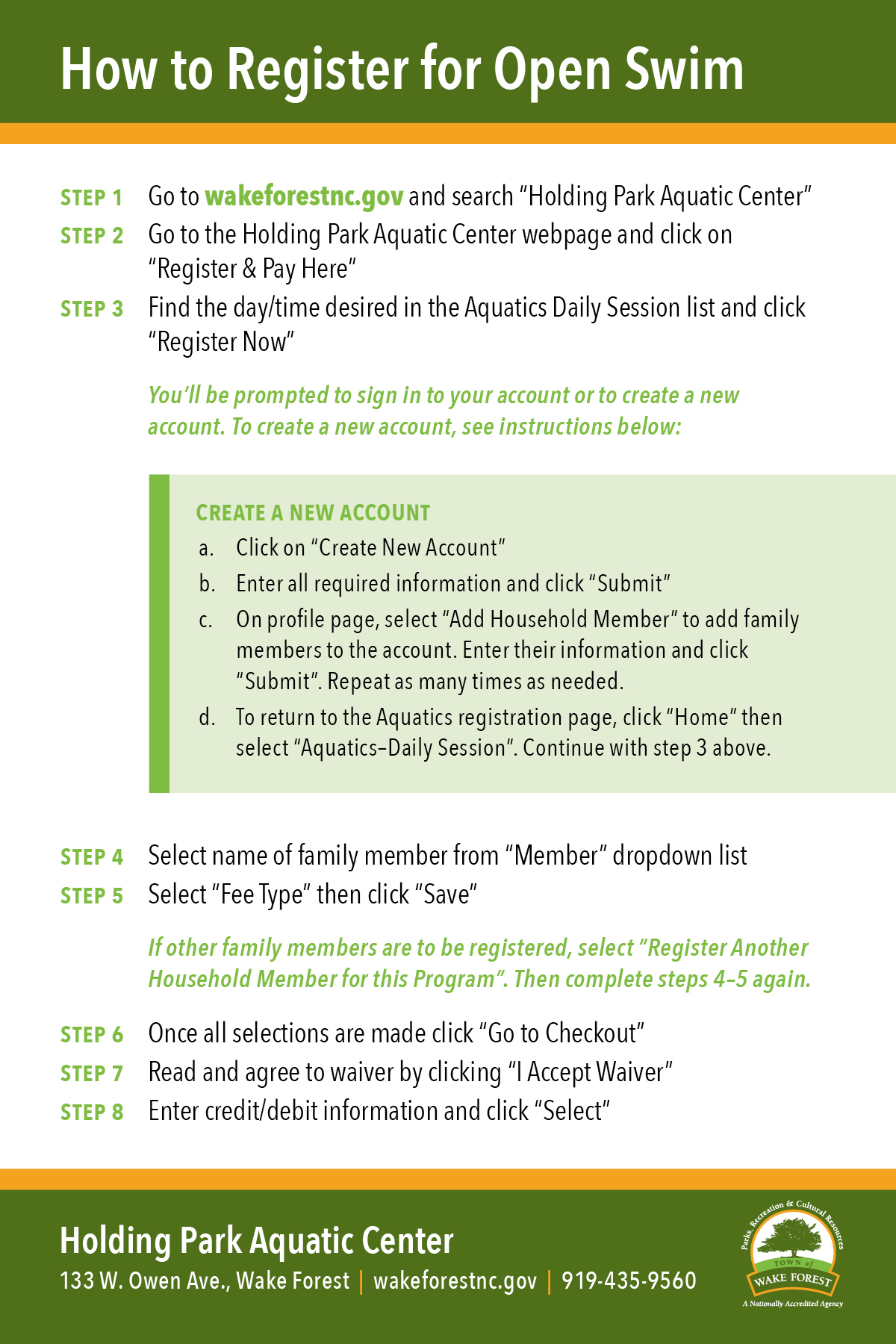 Out of concern for public safety, Wake Forest Parks, Recreation & Cultural Resources has introduced the following measures as part of the facility’s daily operations: