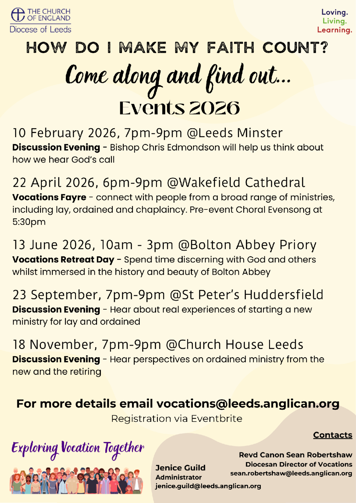 | | | Various dates and times in 2026 | Our Vocations Team are running a series of events in 2026, on the theme of 'how do I make my faith count?' Please see the flyer for more details, and please click here to book. | | | Events across the diocese | | Saturday, January 24, 10am - 12pm, St Mark's Harrogate | |