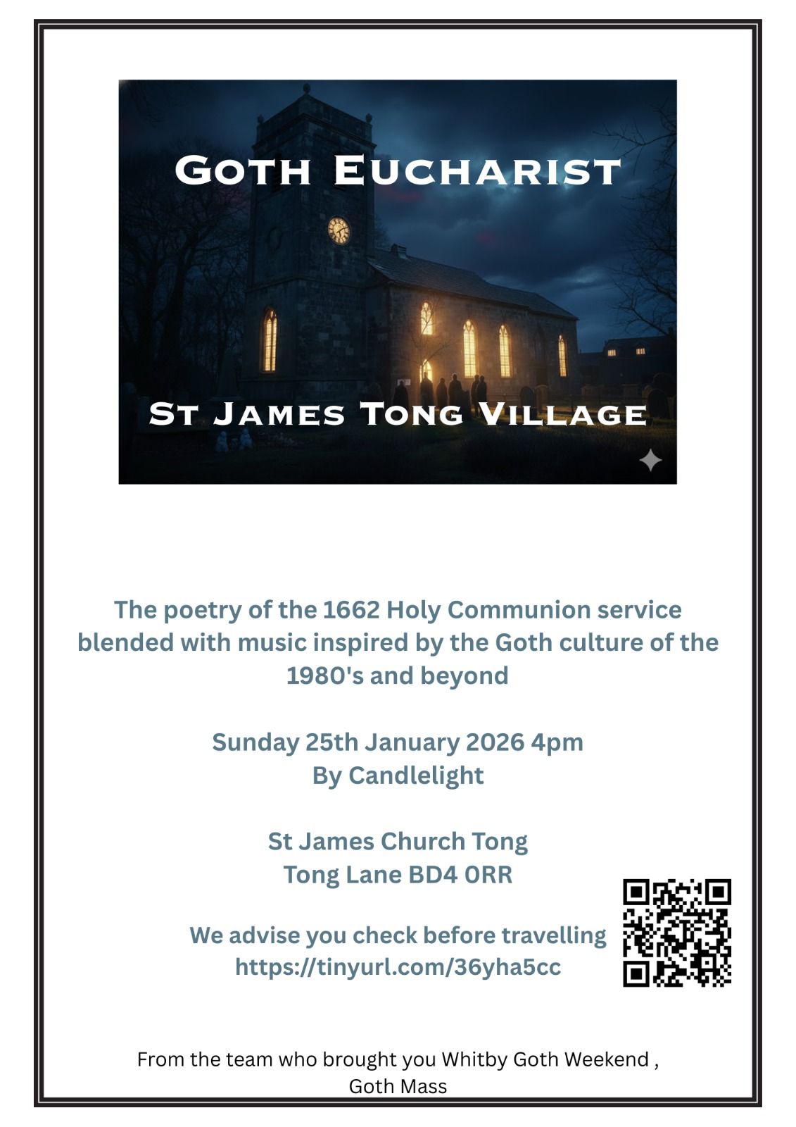 | | | Sunday, January 25, 4pm, St James' Tong | After four years of running events and services at the cliff top church of St Mary’s in Whitby for Whitby Goth Weekend, the team behind this outreach have brought their unique blend of Gothic worship back to the Diocese of Leeds (where most of us are based). Celebrate Candlemas by candlelight at the historic church of St James, Tong, at a Eucharist with a Gothic twist, bleding anglo-catholic tradition, the 1662 Prayer Book and a worship band playing music inspired by Goth artists and culture. Goths, steampunks and all who admire and enjoy the aesthetic and culture are most welcome to join us – wear your finest – we shall! Everyone very welcome. | | | Cranmer Hall Vestments and Book Fair | Friday, February 6, 10am - 2pm, Leech Hall, St John's College | Cranmer Hall is holding its annual vestments fair on Friday 6th February, and all ordinands and clergy are very welcome to attend. The fair will take place between 10am and 2pm in the Leech Hall, St John's College, South Bailey DH1 3RJ. Visitors are asked to sign in at reception. No registration required to attend. | | | Saturday, March 7, 10.30am - 4pm, Bishopthorpe Palace | |