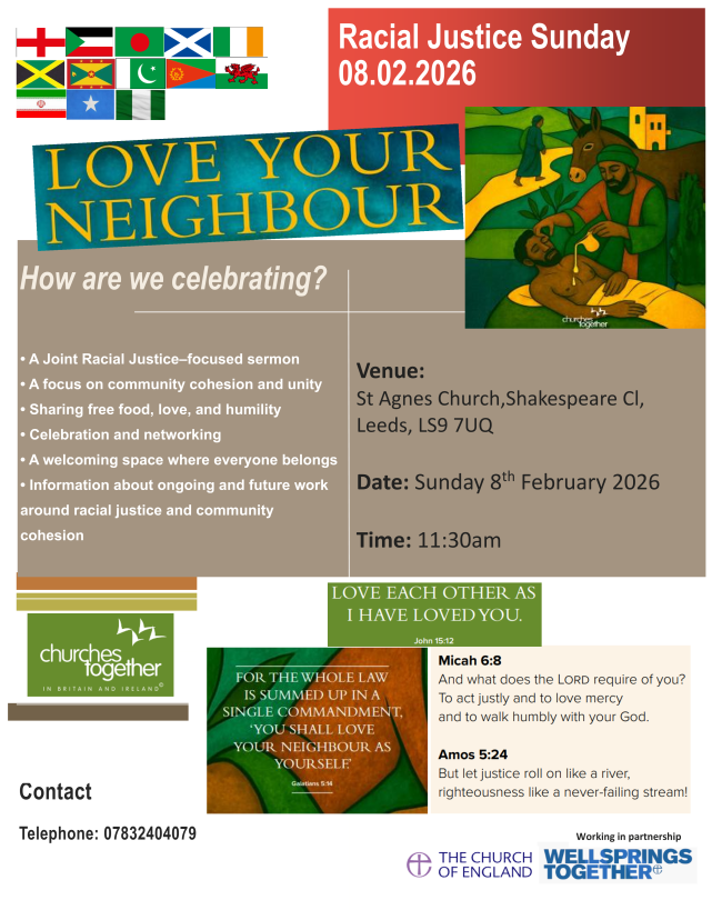 St Agnes Church, Burmantofts, working in partnership with Wellspring Together, will host a special Racial Justice Sunday celebration, bringing together local churches and community members to reflect, worship, and stand united in love and justice.