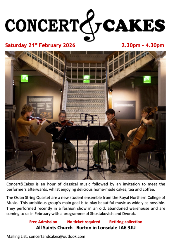 | | | Various dates and times in 2026 | Our Vocations Team are running a series of events in 2026, on the theme of 'how do I make my faith count?' Please see the flyer for more details, and please click here to book. | | | Events across the diocese | | Saturday, February 21, 2.30pm - 4.30pm, All Saints Burton in Lonsdale | The Osian String Quartet, formed in 2023 by Kirin Howat and Jacob Wright, is a chamber quartet that came together to provide high-quality concerts to a diverse audience in the North of England. Founded at the Royal Northern College of Music, the Osian Ensemble have received coaching and lessons with many highly respected international musician tutors including Levon Chillingarian, Susie Meszaros, Donald Grant and Leanord Elschenbroich. The collective take part frequently in competitions and performance opportunities in and around the college and have performed in a diverse number of concerts, presenting an array of repertoire - they performed recently in a fashion show in an old, abandoned warehouse. For their concert here, they will be playing a programme of music by Dmitri Shostakovich and Antonin Dvorak. | | | Monday, March 2, 7.30pm, St Chad's Toller Lane | Mass is sung by the Horsforth Choral Society. Followed by a reception in church. | | | Various dates, 7pm, St Mary's Whitkirk | |
