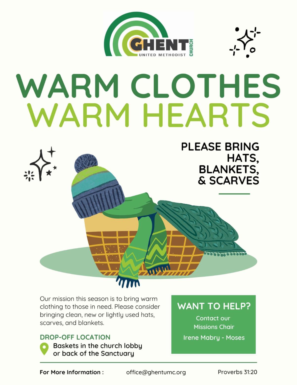 Ghent UMC, led by our Missions Chair, Irene Mabrey-Moses, is collecting hats, blankets, and scarves to provide for those in need. Please bring clean, new or lightly used items and drop them off in the baskets found in the church lobby,