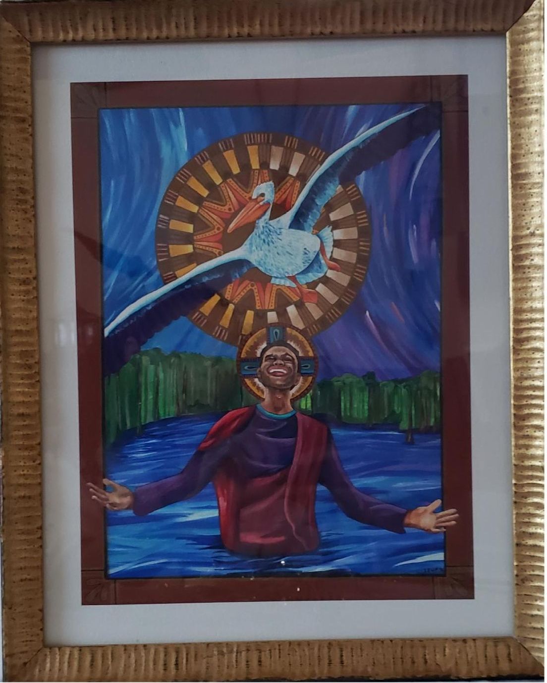 The painting is called Bayou Baptism by Lauren Wright Pittman. She says, "Jesus is stretching out of the frame inviting the viewer to celebrate their own mysterious and wonderful calling from God, as he basks in his own. I chose to paint a pelican for the Holy Spirit's descent, because the scriptural texts leave some room for interpretation; the descending figure is described as "like a dove." So, I decided to paint a pelican which is native to the bayou and was also used to depict Christ's sacrifice in medieval Christian art. God the Creator is represented as the sun, with voice waves radiating from the center, expressing how pleased God is with Jesus."