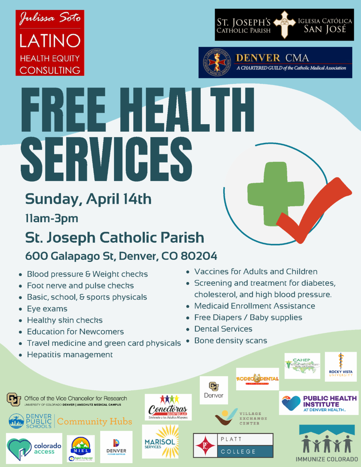 Health Equity Commissioner Julissa Soto is hosting a free health services event on Sunday, April 14, from 11 a.m. to 3 p.m. at St. Joseph’s Catholic Parish located at 600 Galapago St, Denver, CO 80204. The event will include free health screenings, wellness workshops, and community resources. For more information, contact Julissa Soto at julissamolinasoto@gmail.com.