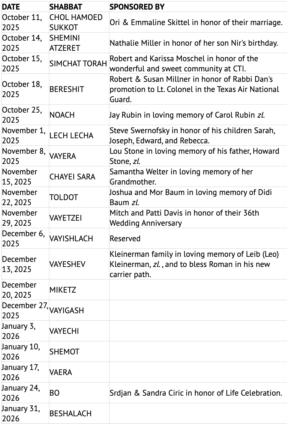 If you have a special day you would like to commemorate with a kiddush, now is a great time to reserve your sponsorship for the Shabbos of your choice. If your date is not visible yet on the kiddush calendar, you can still email Beth and ask about reserving that date. Thank you so much for your support of CTI’s kiddush program.