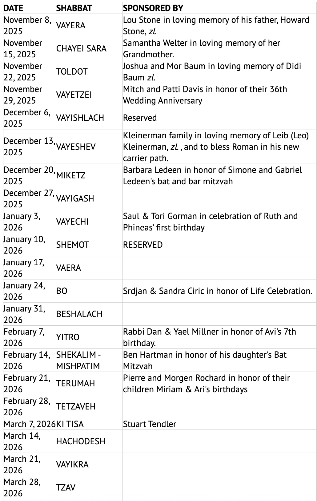 If you have a special day you would like to commemorate with a kiddush, now is a great time to reserve your sponsorship for the Shabbos of your choice. If your date is not visible yet on the kiddush calendar, you can still email Beth and ask about reserving that date. Thank you so much for your support of CTI’s kiddush program.