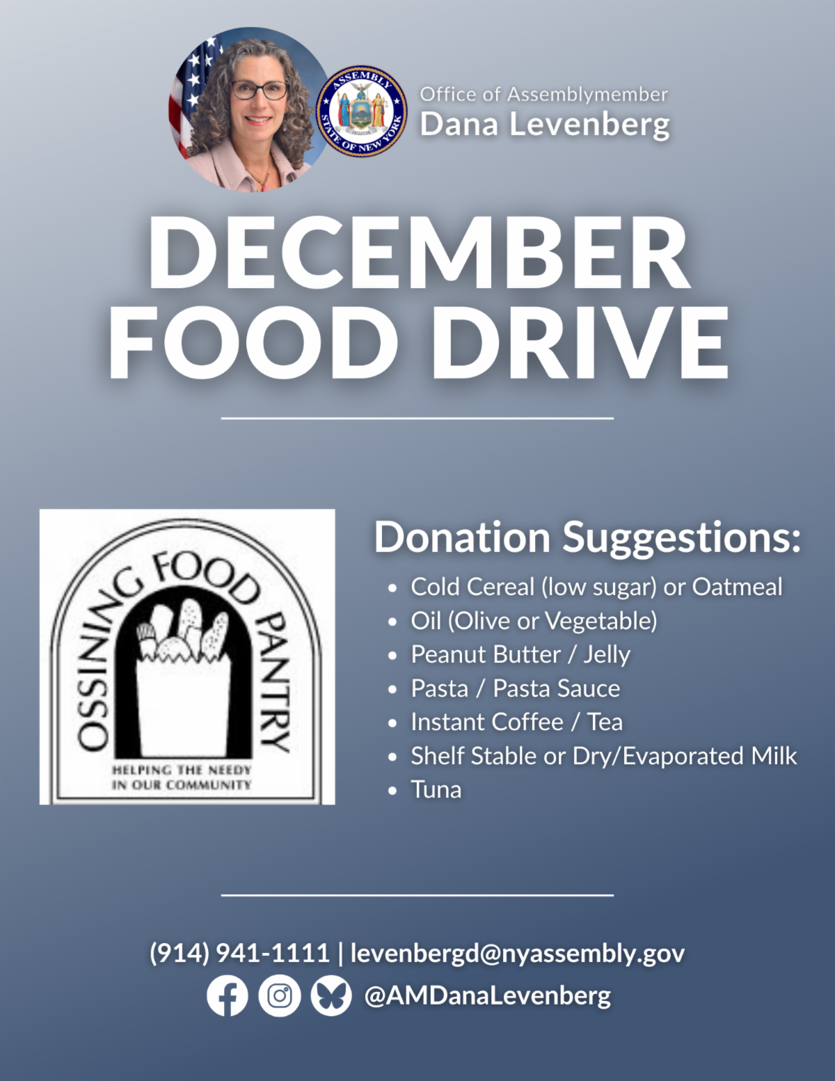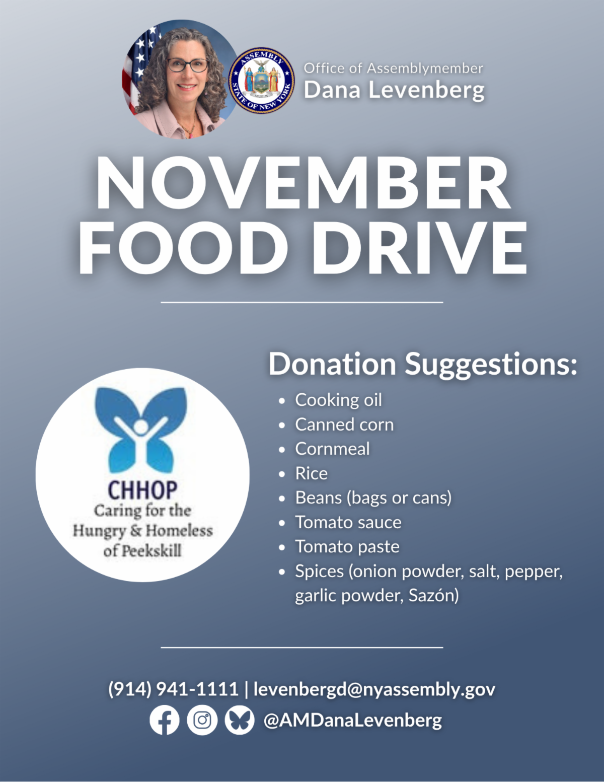 To benefit our local food pantries directly, my office will also begin holding regular food drives. We will collect for and donate to a different local pantry every month, starting with CHHOP/Fred’s Pantry in November and the Ossining Food Pantry in December. I will announce drive-through drop-off dates for November and December soon, and we will also accept food donations at my district office during normal business hours on an ongoing basis. Please feel free to bring any unopened shelf-stable, non-expired food to our office; each pantry also has suggested donations of things that are most useful to them/their community. See the above flyers for more details.