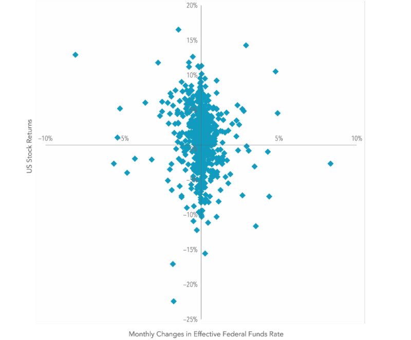 For example, in months when the federal funds rate rose, stock returns were as low as –15.56% and as high as 14.27%. In months when rates fell, returns ranged from –22.41% to 16.52%. Given that there are many other interest rates besides just the federal funds rate, Dai also examined longer-term interest rates and found similar results.