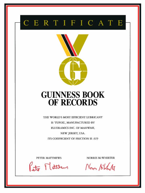 Guinness World Book of Records deemed Tufoil to be the world's most efficient lubricant in 1996 and 1997.