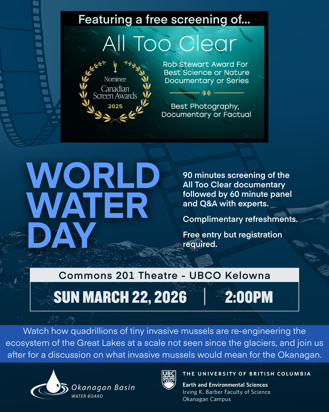 Syilx Territory, Kelowna, B.C. – In recognition of World Water Day, the Okanagan Basin Water Board (OBWB) and the Department of Earth and Environmental Sciences at the University of British Columbia Okanagan (UBCO) invite the community to a free screening of the award‑winning freshwater documentary All Too Clear on Sunday, March 22, 2026. The 90‑minute film will be followed by a 60‑minute expert panel and audience Q&A, with complimentary refreshments. Admission is free, but advance registration is required.