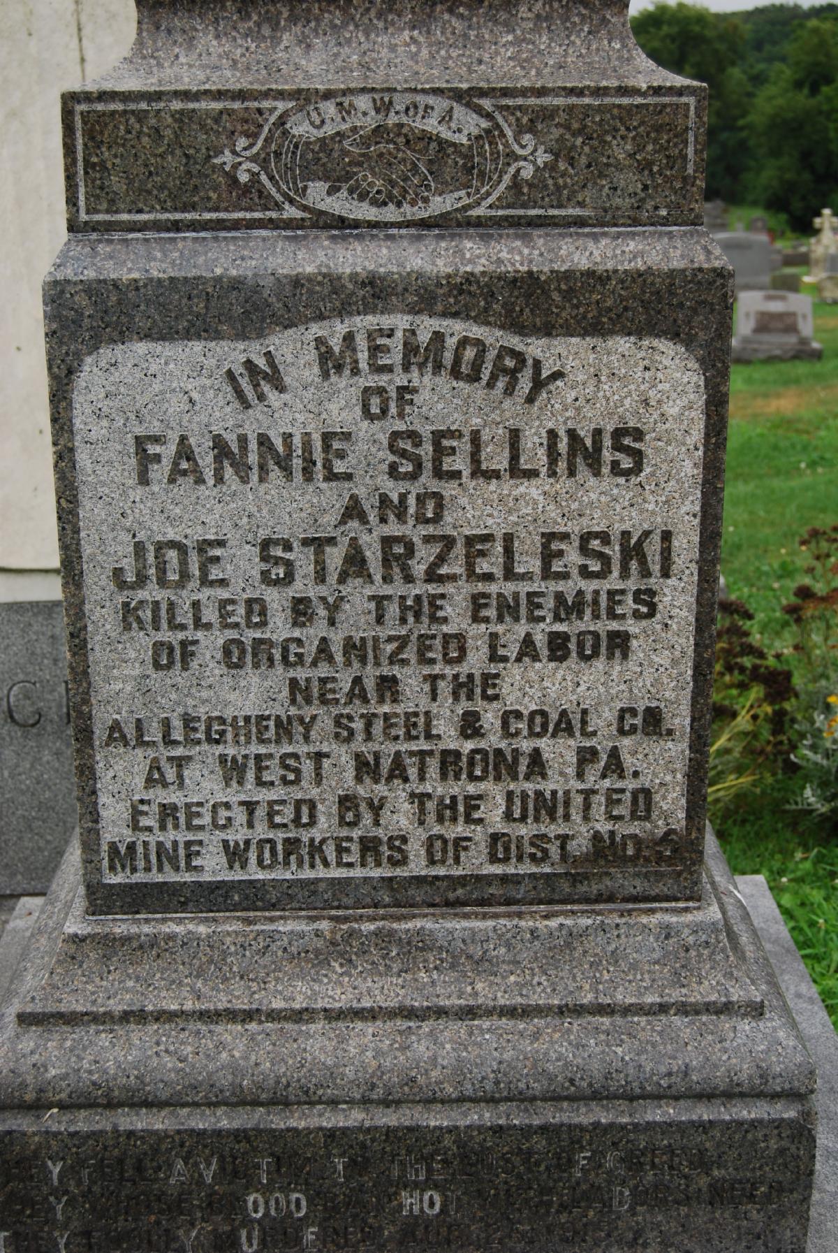 In Pennsylvania's Allegheny Valley, Fannie Sellins lives as a legend which inspires the workers' wives and daughters to steadfastedness in their unionism. A marble monument to her memory and Joe Starzeleski's stands over their graves in Union Cemetery at New Kensington. Annually, on Memorial Day, the women of the valley gather there to hold services and sing the "Fannie Sellins" song in this collection.